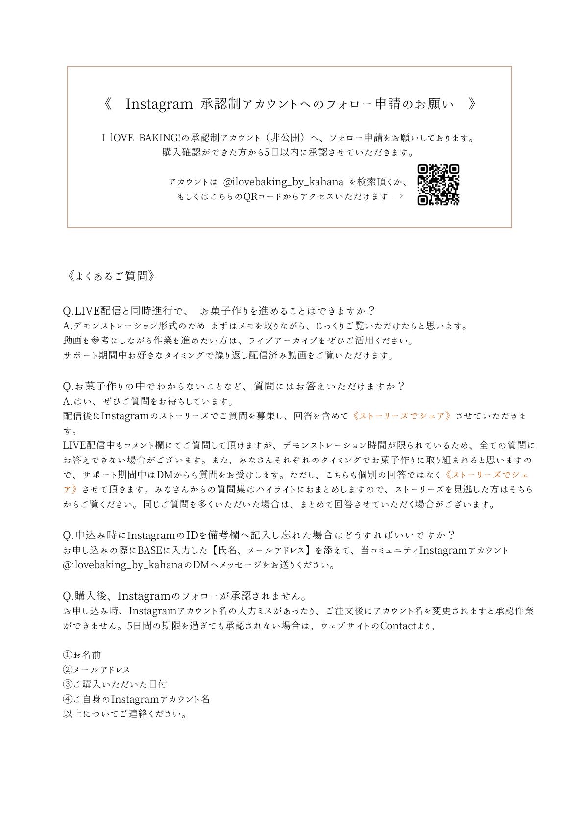 *お申し込み時にインスタグラムIDを備考欄へ記入し忘れた場合、お申し込みの際にBASEに入力した【氏名、メールアドレス】を添えて、当コミュニティInstagramアカウント@ilovebaking_by_kahanaのDMへメッセージをお送りください。